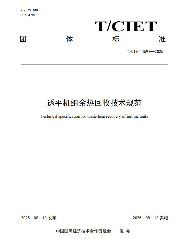 近日,由上海慕帆动力科技有限公司牵头起草《透平机组余热回收技术规范》(标准号:T/CIET 1593—2025)团体标准正式发布并实施。我司总经理林钢先生作为主要起草人参与编撰。